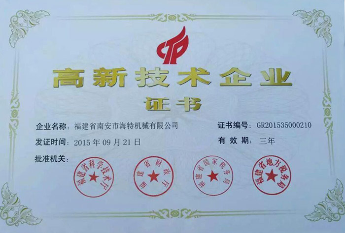 2015年12月8日,福建省科技廳政府信息公開網(wǎng)公布福建省科學技術廳通知文件(閩科高[2015]37號):根據(jù)《高新技術企業(yè)認定管理辦法》(國科發(fā)火[2008]172號)和《高新技術企業(yè)認定管理工作指引》(國科發(fā)火[2008]362號)有關規(guī)定以及《關于福建省2015年第一批高新技術企業(yè)備案的復函》(國科火字[2015]235號),認定海特機械有限公司為福建省2015年高新技術企業(yè)。